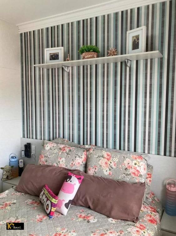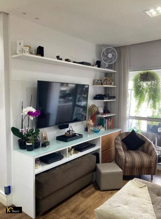 Suíte solteiro com guarda roupas de 6 portas, baú abaixo do painel da tv e armário suspenso estilo prateleiras.