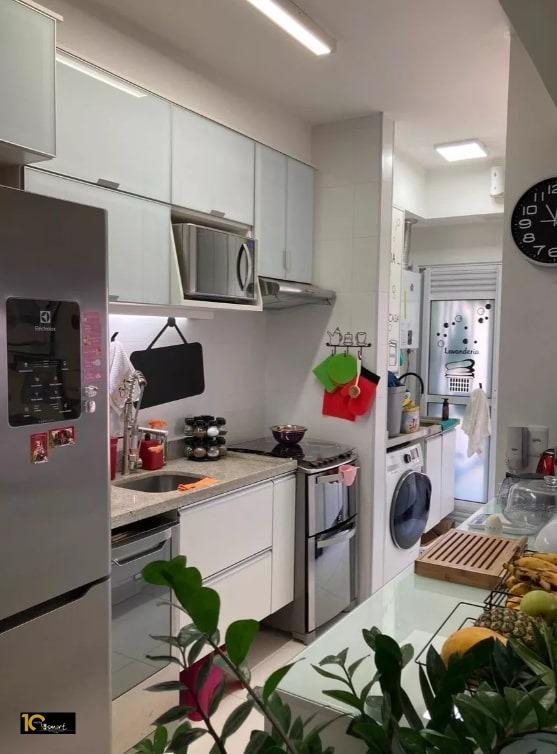 Cozinha americana e área de serviço repleta de armários, espaço para lava louças, fogão 4 bocas, exaustor, microondas, geladeira side by side, máquina de lavar e secar roupas com abertura frontal.